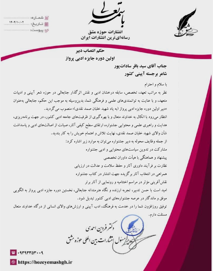 به گزارش روابط عمومی انتشارات بینالمللی حوزه مشق، با حکم دکتر فردین احمدی رئیس شورای سیاستگذاری جشنواره، سید باقر ساداتپور شاعر برجسته آیینی کشور، به عنوان دبیر اولین دوره «جایزه ادبی پرواز» (به یاد شهید خلبان صمد نقدی) منصوب شد.