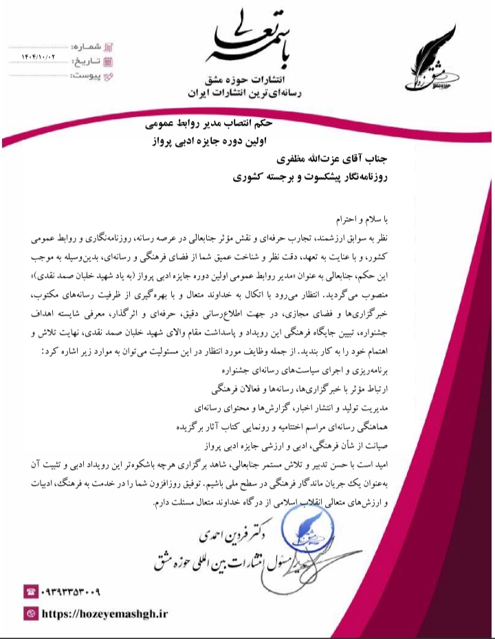 به گزارش روابط عمومی انتشارات بینالمللی حوزه مشق، با حکم دکتر فردین احمدی، رئیس شورای سیاستگذاری جشنواره، عزتالله مظفری روزنامهنگار پیشکسوت و برجسته کشوری، بهعنوان مدیر روابط عمومی اولین دوره «جایزه ادبی پرواز» (به یاد شهید خلبان صمد نقدی) منصوب شد.